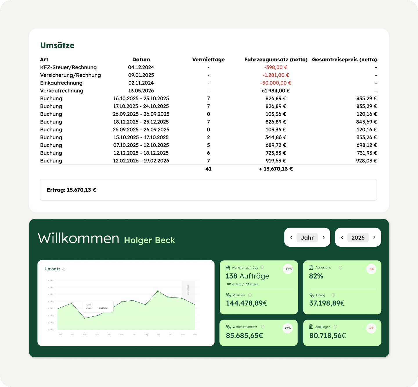 Campware.io ermöglicht es, Umsätze und Kosten und damit die Rentabilität aller Ressourcen, egal ob Fahrzeug, Teileverkauf oder Personal, auswertbar zu machen.