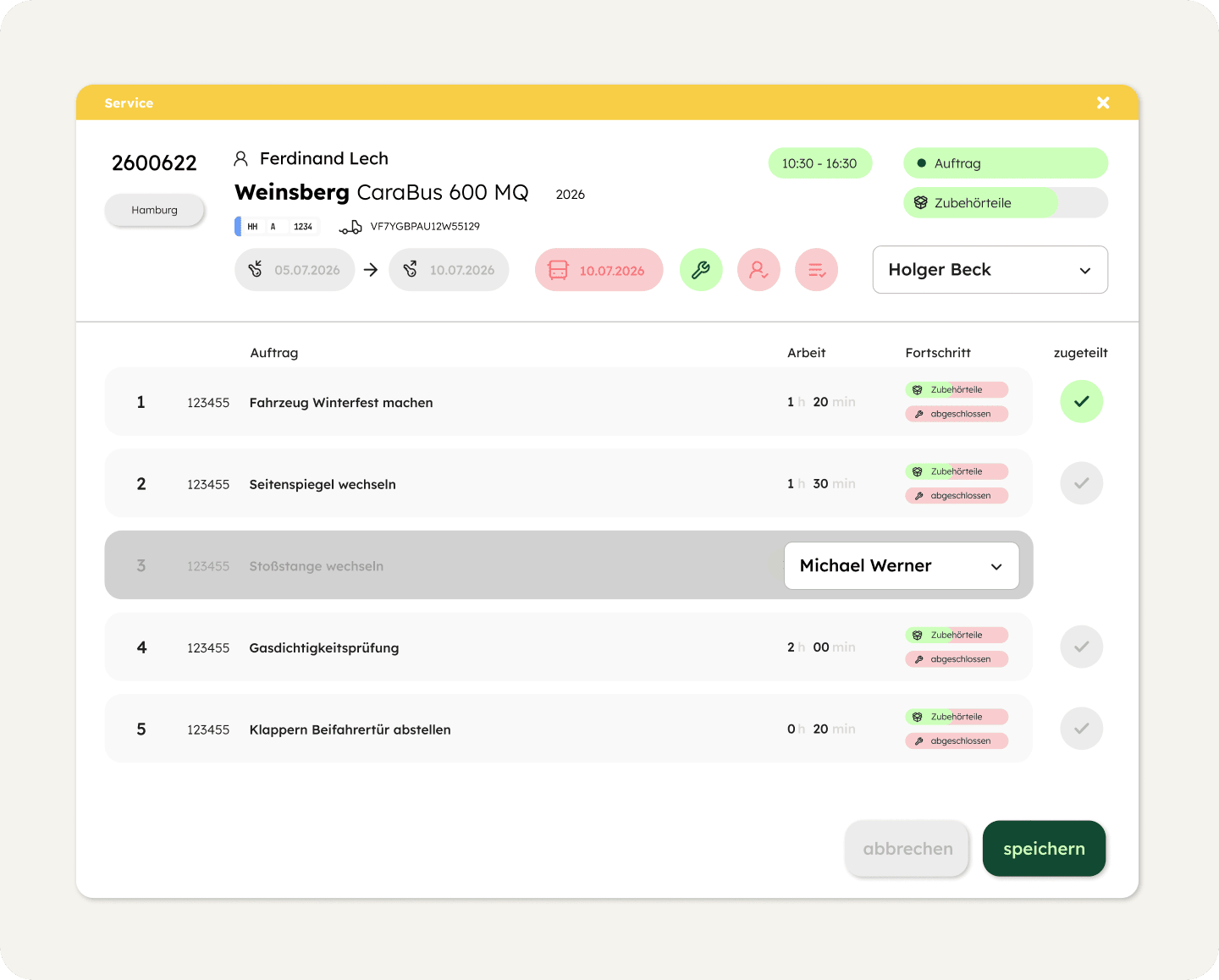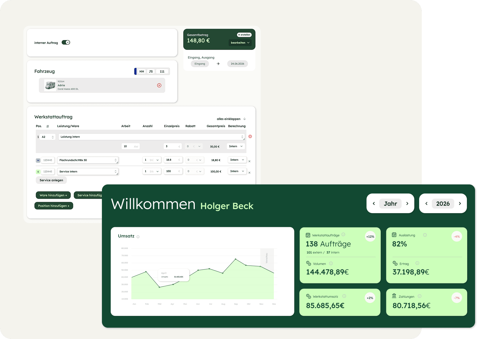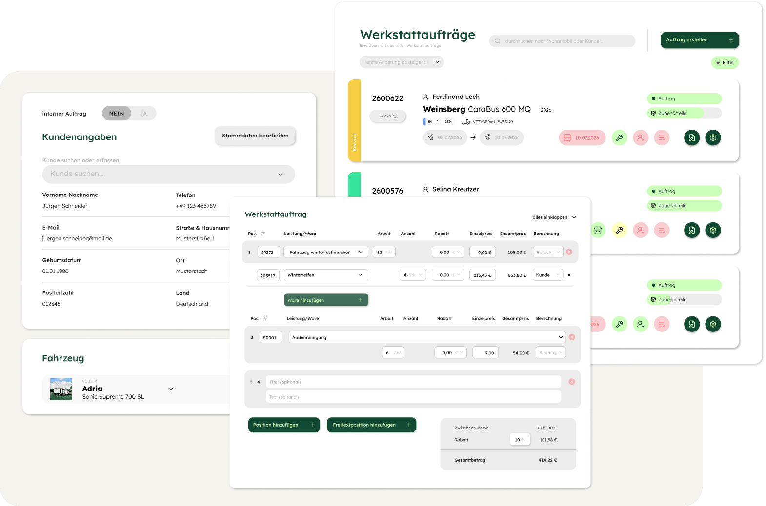 Campware.io bietet, alle für den Betrieb und die Abrechnung einer Reisemobil-Werkstatt notwendigen Funktionen und Prozesse. Dabei sind andere Ressourcen, wie die Warenwirtschaft, Verkauf und Buchhaltung stets eng mit dem Werkstattmodul verzahnt.