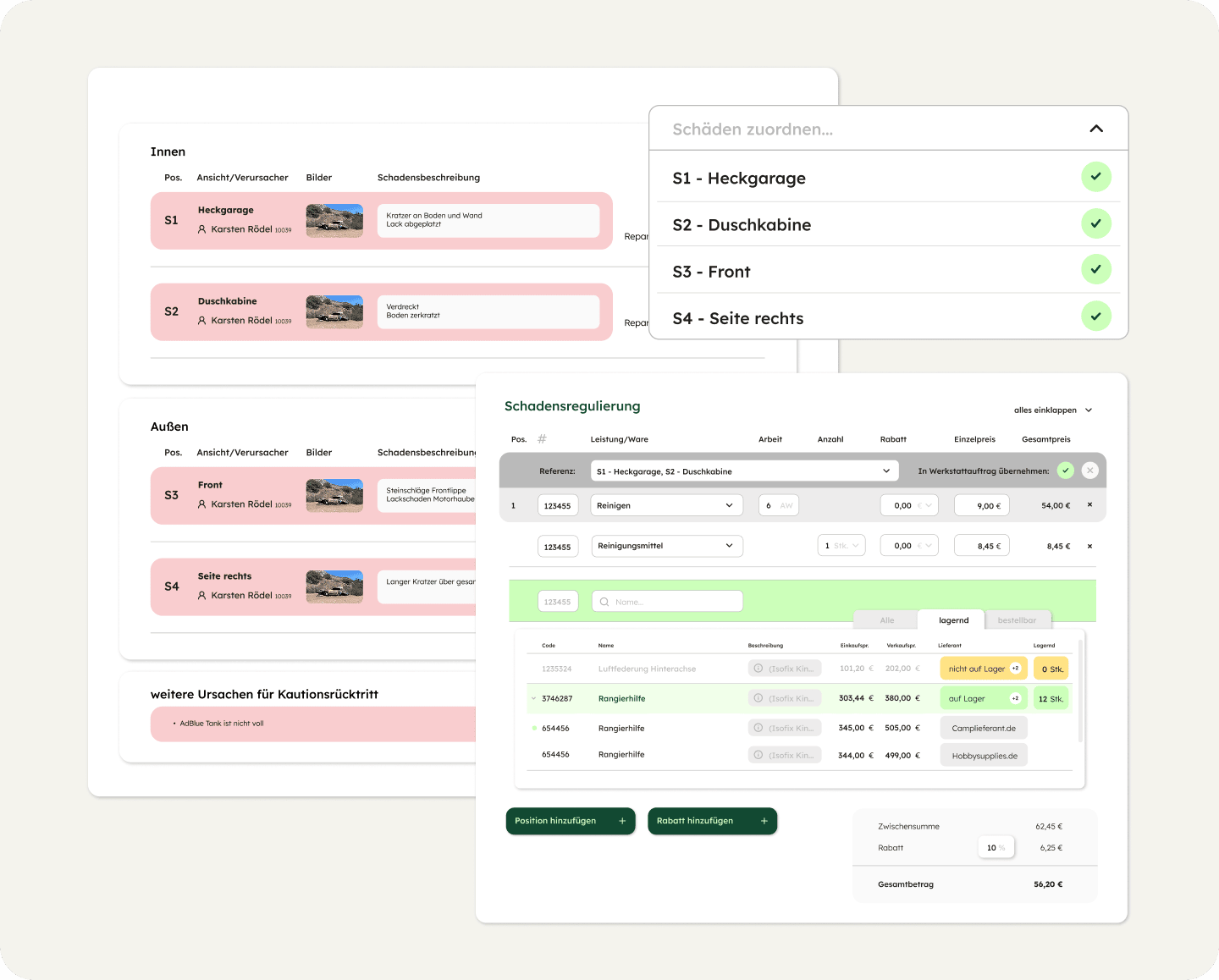 Das Werkstattmodul ist eng mit Vermietung verzahnt. Ein leider häufig auftretender Fall ist die Beschädigung von Fahrzeugen innerhalb der Vermietung. Campware.io erlaubt nicht nur, die Schadenreparatur digital zu steuern: Schon bei der digitalen Erstellung des Rücknahmeprotokolls stellt campware.io einen Schaden fest. Infolgedessen wird die hinterlegte Kaution des Mieters blockiert, der Servicemitarbeiter erhält den Auftrag, den Schaden zu bewerten. Im Zuge der Schadensbewertung erstellt dieser einen Werkstattauftrag und disponiert die entsprechenden Teile aus der Warenwirtschaft und die Werkstattmitarbeiter zur Umsetzung. Die Rechnung für die Schadensreparatur wird direkt aus dem Werkstattauftrag erstellt und mit dem Kunden verknüpft. Dies erlaubt eine direkte Verrechnung mit der hinterlegten Kaution. Hat der Mieter eine Reiseversicherung abgeschlossen, kann aus der Schadensbewertung automatisch eine Meldung an die Versicherung sowie eine Abtretungserklärung gesendet werden.
