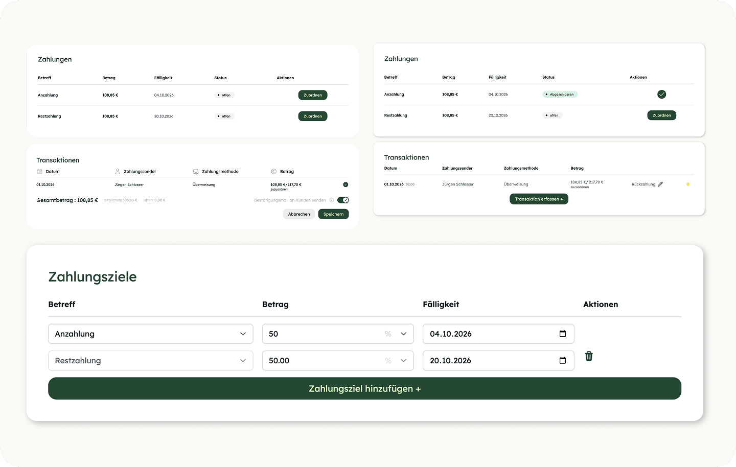 Die Abwicklung von Zahlungen im Zusammenhang mit Werkstattdienstleistungen ist direkt in campware.io möglich. Nicht nur die Rechnungslegung inklusive Abschlagsrechnungen erfolgt direkt über das Buchhaltungs-Modul, auch die Erfassung und Zuordnung entsprechender Zahlungen bzw. Transaktionen ist direkt im jeweiligen Auftrag möglich.
